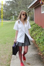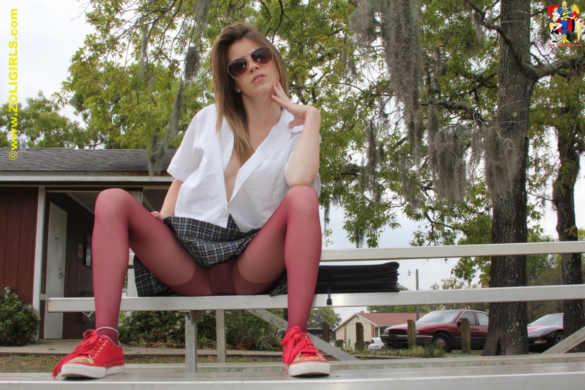 18 year old cutie Alaina is playing the role of naughty schoolgirl perfectly in this free gallery from Zoligirls. Check her out as she skips school wearing a short plaid skirt and a white top she has unbuttoned almost to her stomach. She’s looking very cool as well in her aviator sunglasses but the thing that will most likely draw your attention is the coloured pantyhose she has on those slim legs of hers. Alaina sits on the bench and spreads her legs, teasing you with a nice upskirt view before unbuttoning her shirt entirely and presenting those tiny tits to the camera. Her sneakers come off and her nylon-clad feet are the next weapon in her arsenal to tease the hell out of us. Big fan of this girl here at the blog and keep an eye out for more of her in the near future!