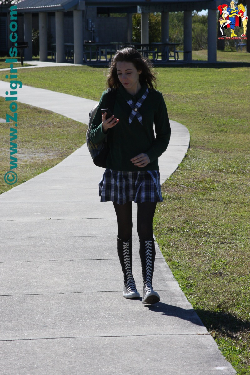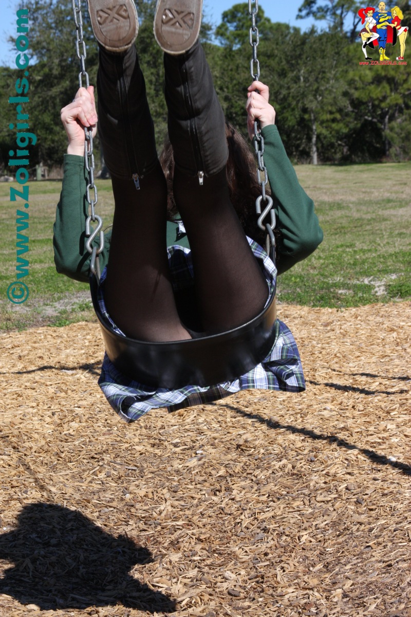 Jackie from Zoligirls is looking very cute and sexy in this free schoolgirl pantyhose gallery from the site. She’s out for a stroll after school wearing a short plaid skirt with black tights and a pair of knee high Converse shoes. This is an outfit that you’ll see quite regularly at Zoligirls and one that we never get tired of. Jackie hops on the swings and pumps those legs furiously to get some height. One of the advantages of this part of the shoot is the fact that you get to see up her skirt when she extends her legs high in the air. There’s some more pantyhose upskirt action when she takes a rest on some of the park equipment. Hope you’ve enjoyed the gallery and be sure to head over to Zoligirls to see more of Jackie and other cute amateur girls in schoolgirl uniforms and nylons.