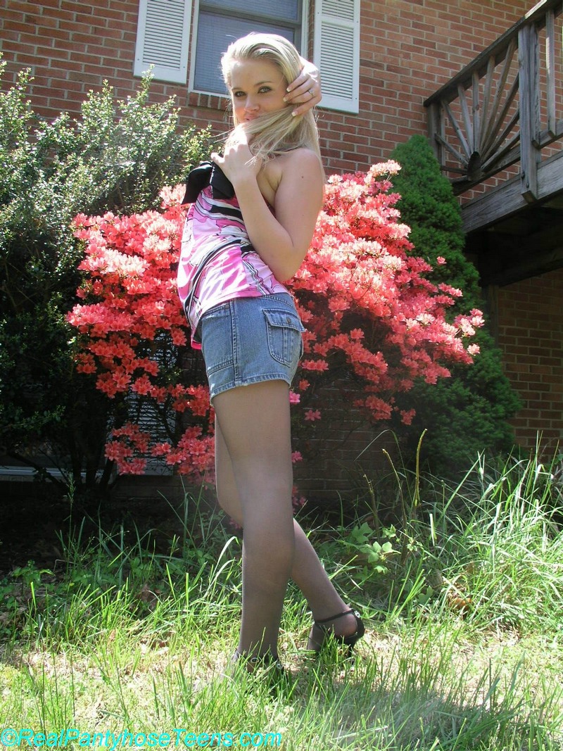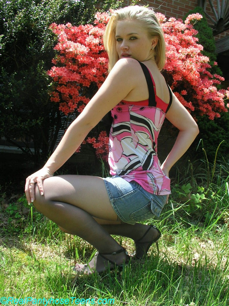 Stunning blonde teen model Mercedes in a jean skirt, high heels and pantyhose