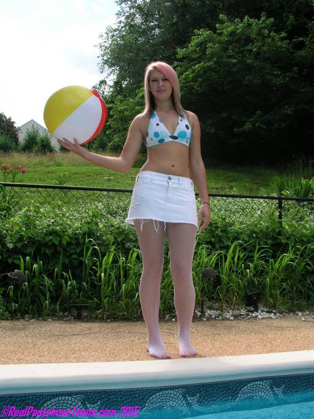 Katie from REAL PANTYHOSE TEENS is a stunning young lady and one that I have always enjoyed seeing featured in one of the site’s updates. The images that I have included in this gallery are from an older release but I don’t think you’ll mind once you get to check her out for yourself. This cutie is sitting by the pool in her short white miniskirt with a bikini top and fishnet pantyhose. She’s got a pink tint to her hair, a new look for her but one that really suits her. I know, I know. Who’s looking at her hair, right? You guys and gals are probably enjoying those beautiful legs or checking out her body when she pulls off that skirt to pose in her bikini and pantyhose. If you like wet pantyhose, you’ll love what comes next as Katie decides to go for a dip in the pool, hopping back out once her fisnets are soaked. Enjoy the free gallery and don’t forget to drop by Real Pantyhose Teens and check out all their sexy amateur models in hose.