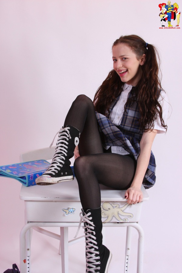 Ok, so we have a confession to make. We’re head over heels in love with teen cutie Sarah from ZOLIGIRLS. She is a real amateur cutie and always seems to be having so much fun when she’s dressed up in sexy outfits and pantyhose. Sarah also seems like she really enjoys stripping for her fans as well. Here’s another free gallery of this hot leg model wearing a schoolgirl uniform with black opaque pantyhose and those knee high Converse shoes that lace up the front. Her hair in pigtails is a rather nice touch as well if you ask us! Sarah playfully lifts her skirt and flashes us in various ways before pulling off her uniform and posing in her red bra. She unleashes one of those beautiful tits by pulling down the front of her bra. That last image of her biting her bottom lip… holy shit that’s hot!