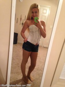 Kelsey from REAL PANTYHOSE TEENS is showing off that hot and sexy body of hers in these free pantyhose selfies from the website. This girl looks so damn sweet and sexy as she poses in front of the mirror wearing tight little jean shorts with shiny pantyhose and a sexy white top. You get a pretty great view of her legs and ass when she turns her back to the camera and looks over her shoulder to snap a shot. Kesley removes her shorts and shirt to pose in a sexy pink bra and panty set. That last image of her cleavage showing off her small tits is amazing. We’d love to get our hands on those perky little tits. Enjoy the free gallery and if you’d like to see more of Kelsey, be sure to visit Real Pantyhose Teens today!