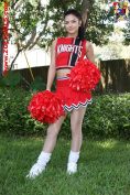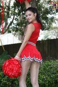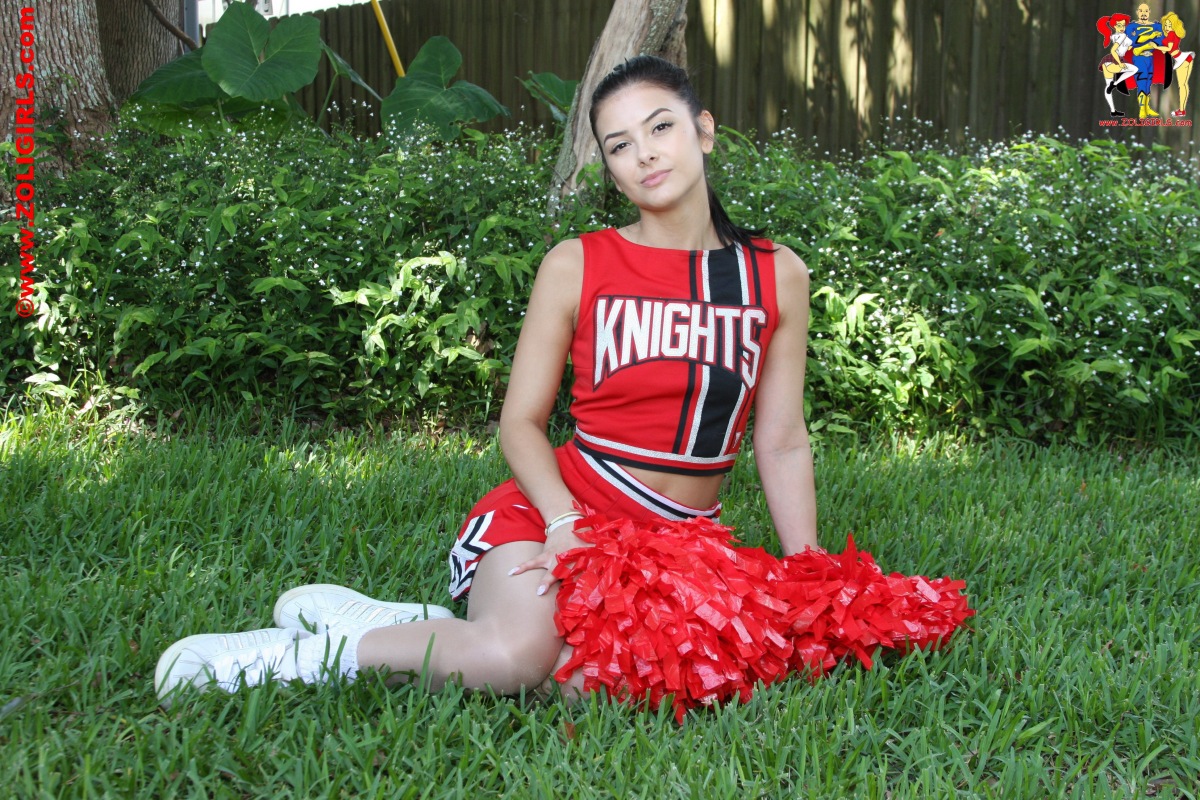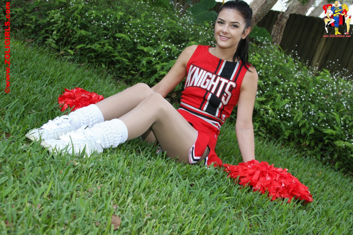 Hats off to Zoli over at ZOLIGIRLS. He has done it again! He’s found another beautiful amateur model and convined her to appear at his site in sexy uniforms and pantyhose. We featured this cutie once already at the blog and as long as he keeps using her in his updates, we’re going to keep sharing! Check out this great gallery from the website in which Katie is posing in a sexy cheerleader outfit with socks and shiny pantyhose. She does a high kick, which gives us a look up her skirt before bending at the waist and flashing her ass to the camera. What follows is a pretty damn sexy striptease that leaves her topless and showing off her tiny teen tits. Enjoy the free gallery folks and click the banners below to see more of this beautiful young lady and other hot amateur models in uniforms and tights.