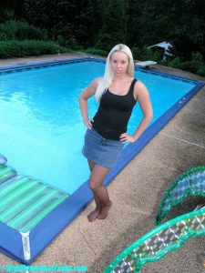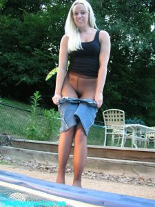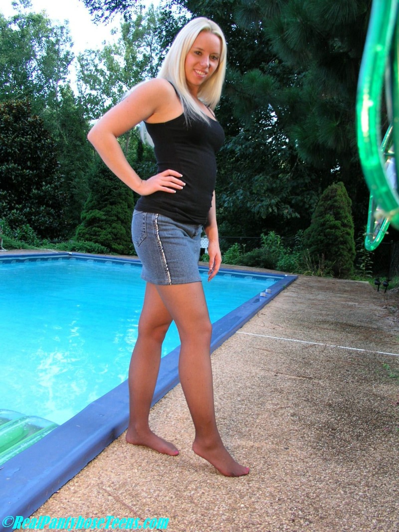 So we’ve been going through the archives of REAL PANTYHOSE TEENS recently to see if we haven’t shared any content that featured some of our favorite girls. One of the names that popped up was hot blonde babe Chloe Mae. We realized there’s a few of her updates that you may not have seen as of yet so we thought we would take some time to share it with you folks. Check out this free gallery from the site in which this cutie starts by the pool in her jean skirt with sheer pantyhose and tight black top. She gets down to her bra and panties before entering the pool… fans of wet pantyhose are going to love this particular update! When Chloe Mae gets into the pool, she turns her back to the camera and removes her bra. You don’t get to see those lovely tits her but you will be able to check them out when you head over to Real Pantyhose Teens and get instant access to their amazing archive of amateur models in their sexy outfits and nylons!