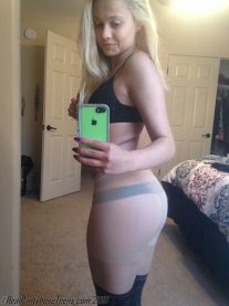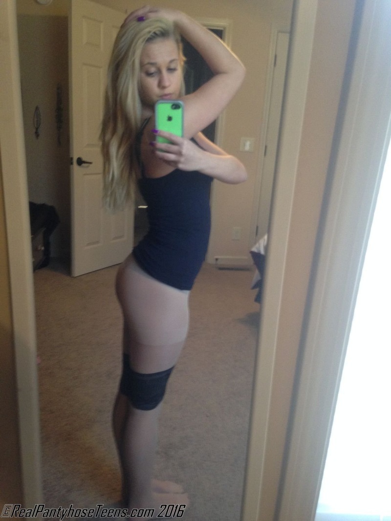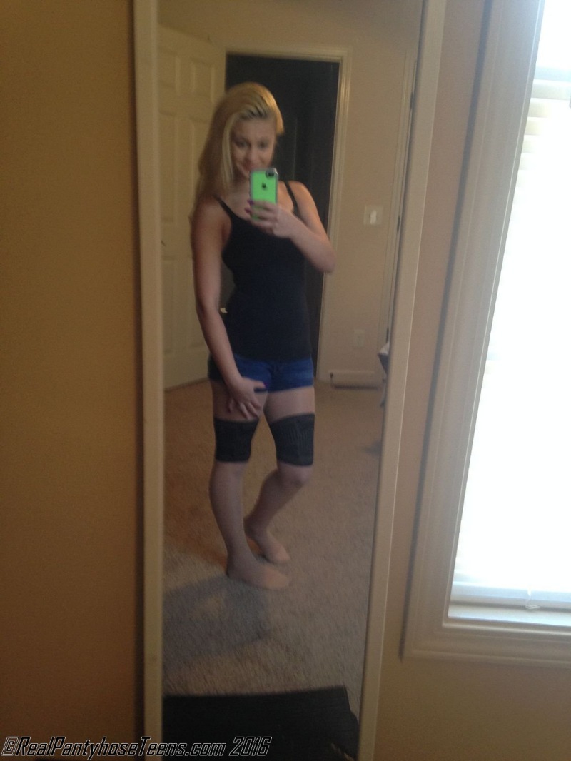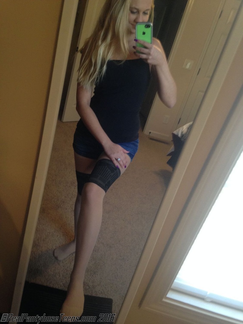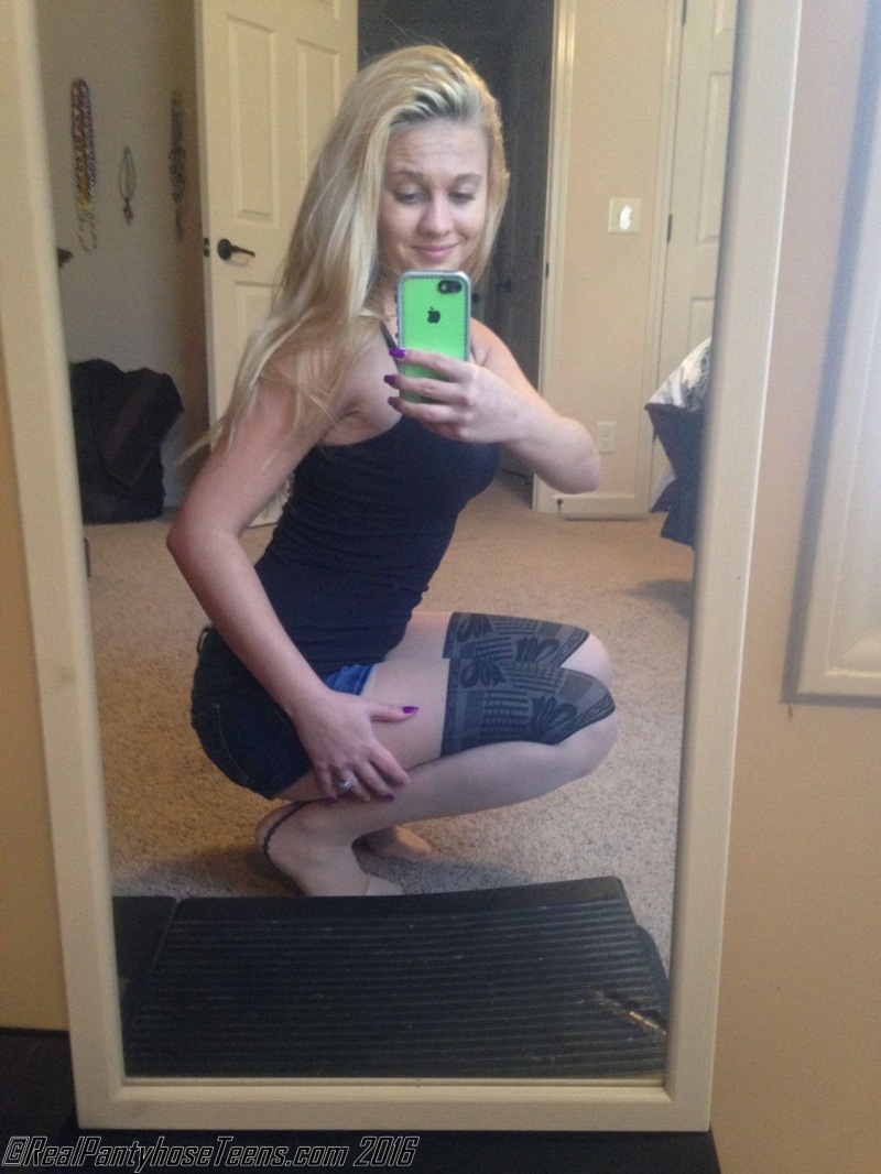 Our favorite pantyhose selfie queen is back in another hot gallery from Bob and the crew over at REAL PANTYHOSE TEENS. This sexy blonde teen is posing for us in front of the mirror wearing a tiny pair of jean shorts with very cool patterned pantyhose. They look like they’re sheer white control top hose with a black patterned section above the knees. Kelsey pulls off her shorts and top to pose in bra, panties and nylons. If you like sexy feet in hose, you’ll also get a pretty good look at hers throughout the photoshoot. Thanks for stopping by and if you’d like to see more of Kelsey, make sure you head over to Real Pantyhose Teens and get instant access to all her amazing updates!