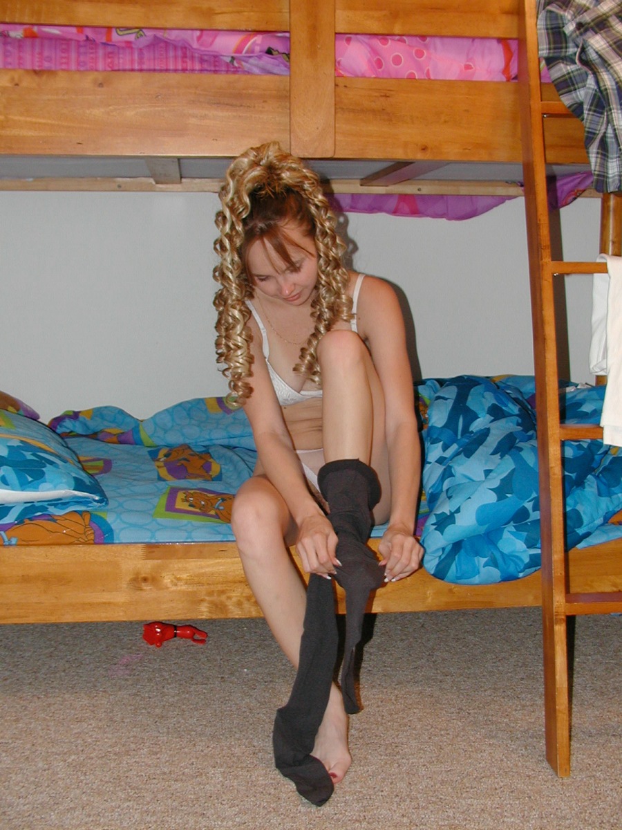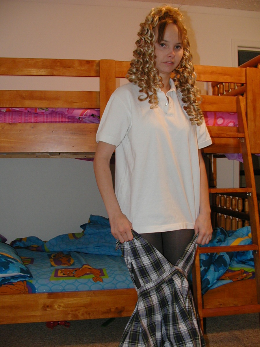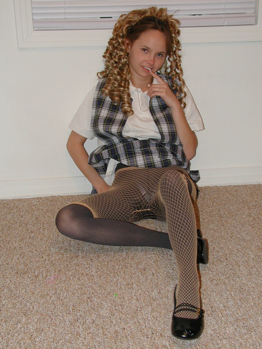 Kris from ZOLIGIRLS returns to our site here again and in this gallery instead of you watching her strip our of her schoolgirl uniform, you’ll get to see her put it on! She’s in the bedroom showing off her petite frame in her bra and panties and starts putting on her gray shiny pantyhose. Her white blouse and the minidress school uniform is next. She slips those sexy feet into a pair of flats and then takes a moment to strike a few poses to make sure she has our attention. Boy does she ever! Those legs and that tight teen ass kind of make it hard not to. Kris starts putting on some fishnet hose over her tights for all of you who like the layered nylon look.