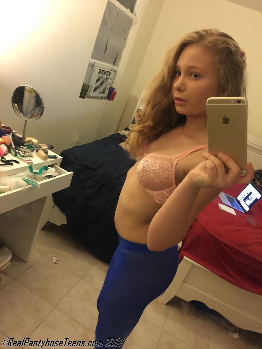 The folks over at REAL PANTYHOSE TEENS have done a great job of adding pantyhose selfies to their regular updates and its something that we really have enjoyed seeing. One model that we always enjoy seeing in front of the mirror with phone in hand is Chanel, a petite amateur girl that has also appeared in some regular updates at the site as well. In these free images from RPT, Chanel is posing in nothing but a pair of blue opaque tights and a t-shirt. Her top is quickly pulled off and Chanel poses in her bra and pantyhose. Don’t those small teen tits look amazing encased in her pink lace bra? Enjoy the free gallery and if you’d like to see more of this cutie and other amateur models in sexy outfits and pantyhose, head on over to Real Pantyhose Teens today!