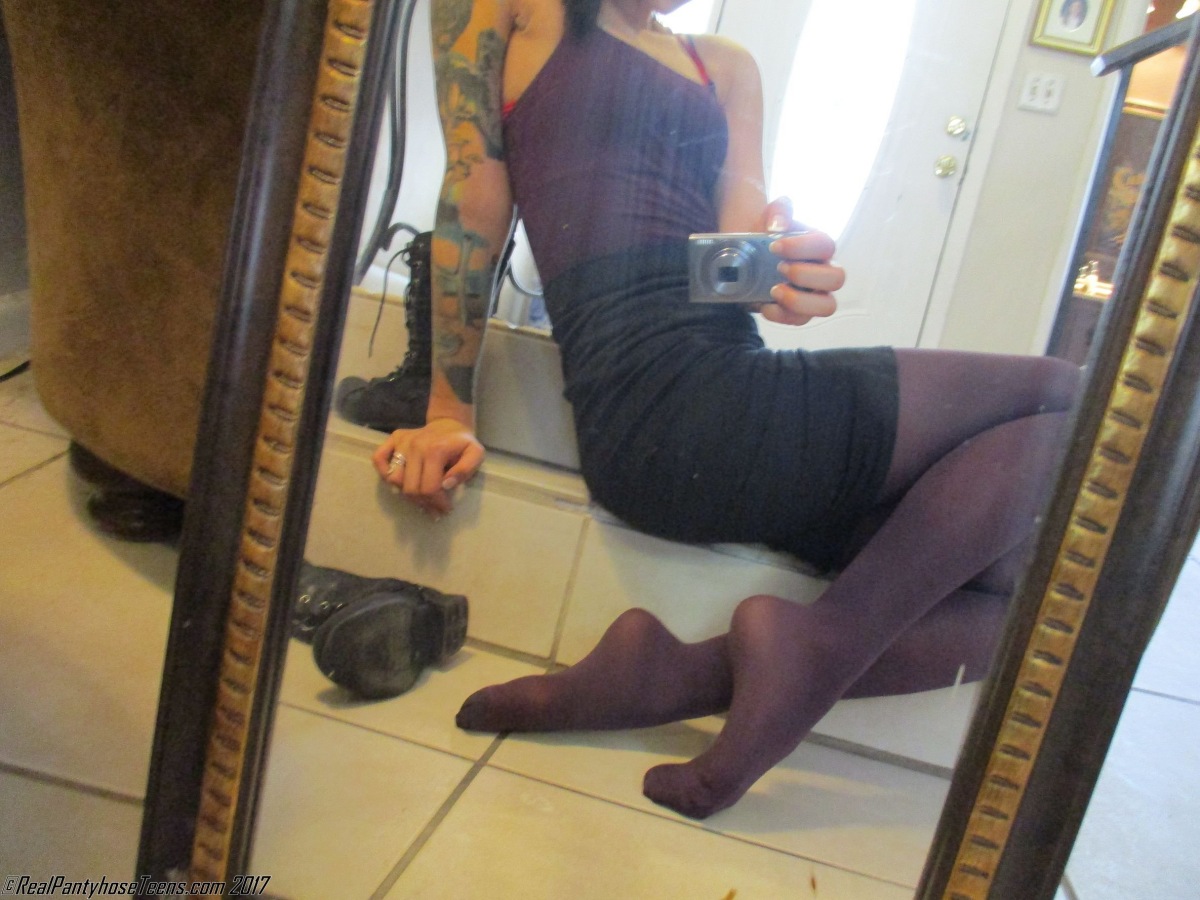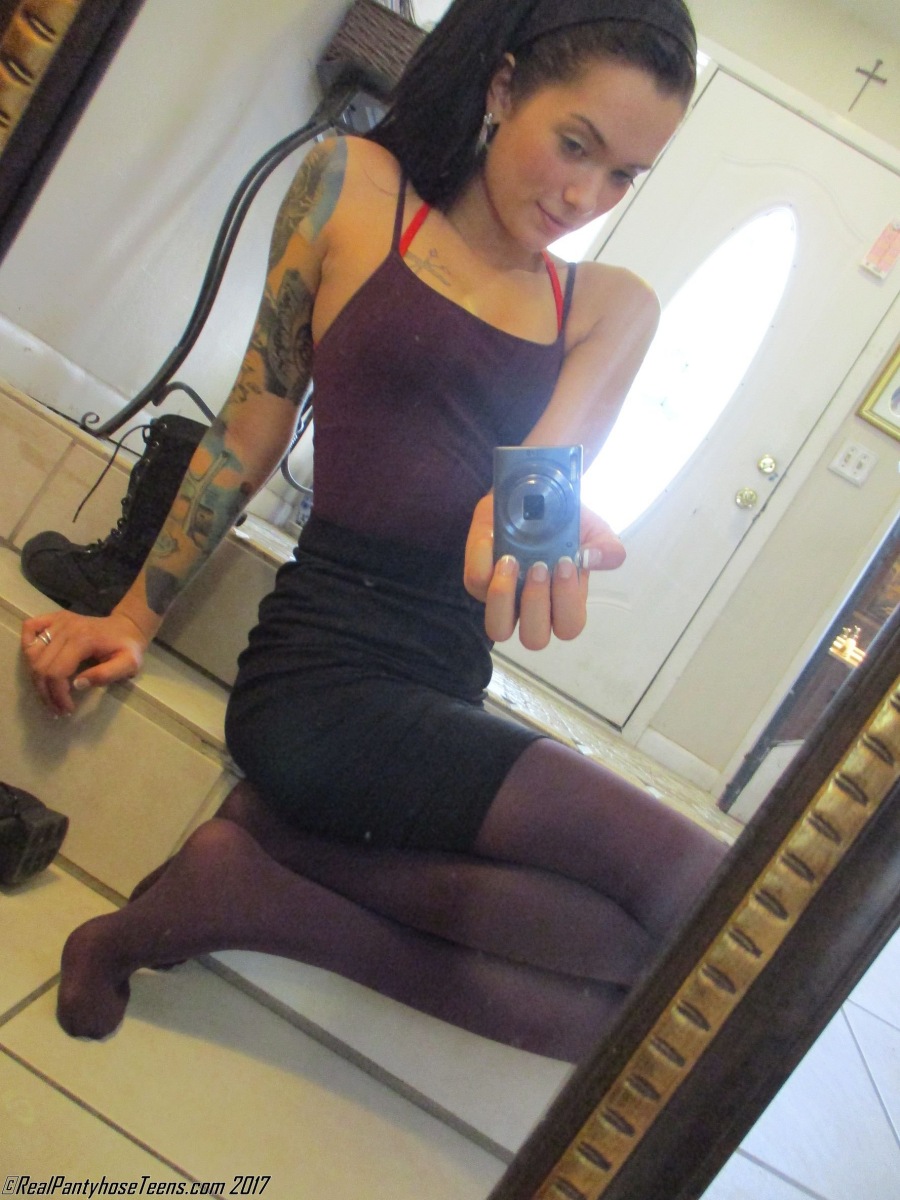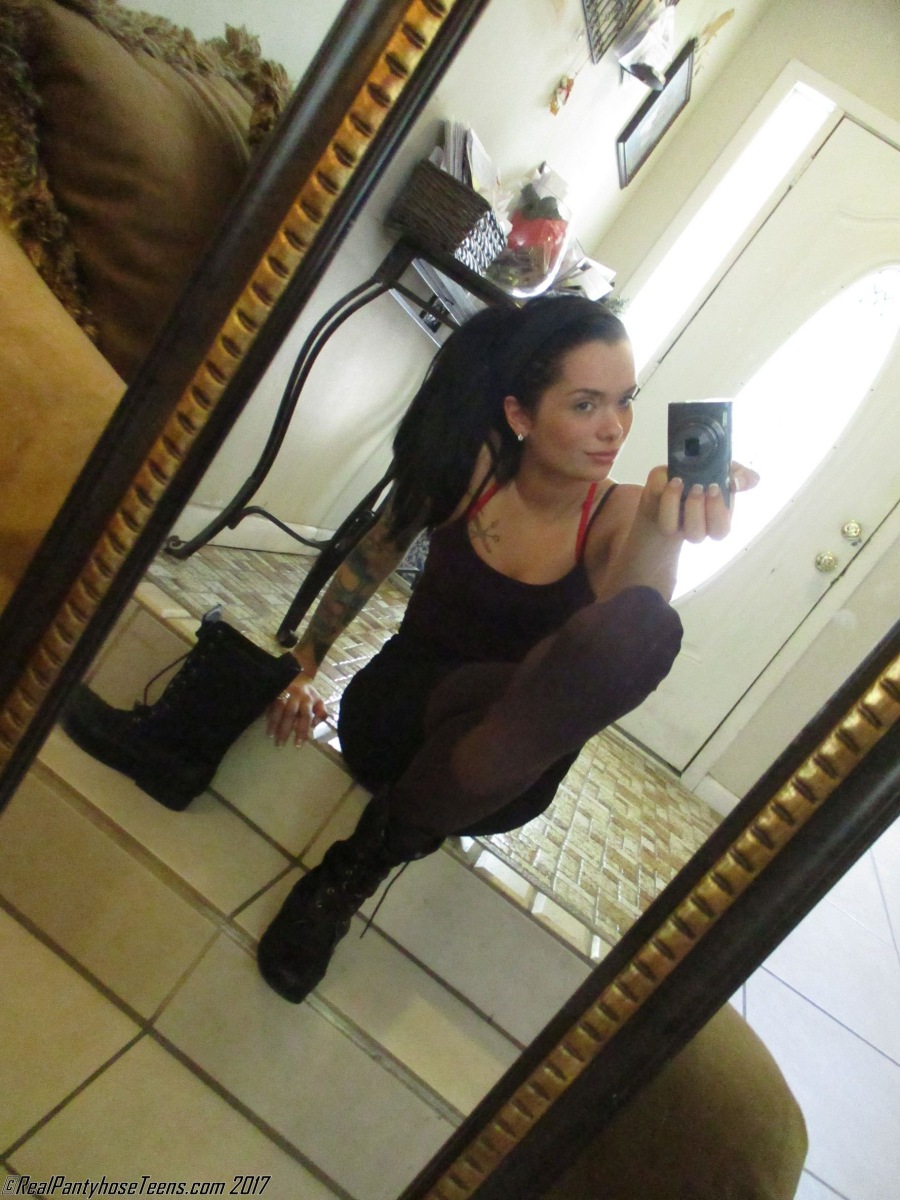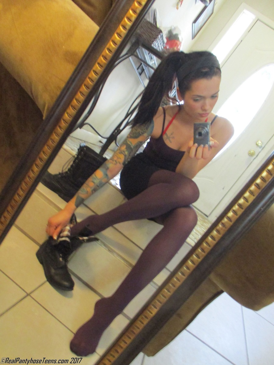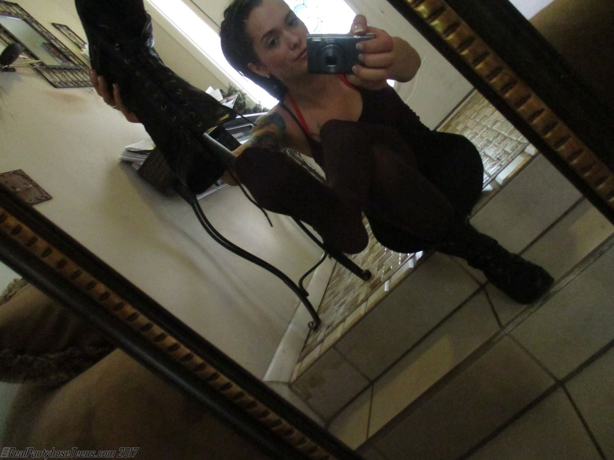 One of the favourite things that REAL PANTYHOSE TEENS has done over the last couple of years is introduced pantyhose selfies to their website. This has allowed us to be introduced to some models that would not have been on the site otherwise. There’s just something so damn sexy about a girl grabbing her phone and taking some mirror shots of herself knowing full well that horny lads around the world are going to be aroused by them. Maria Marley is one of those gals an in this free gallery she’s posing for us in a sexy black minidress with boots and opaque pantyhose. The dress comes off to reveal her bra and that killer ass of hers in tights. Enjoy the view… we sure did!
