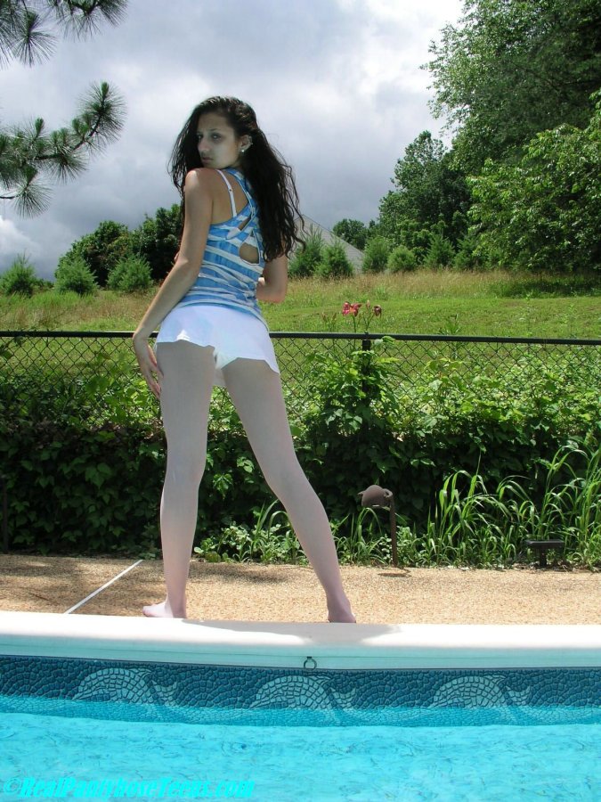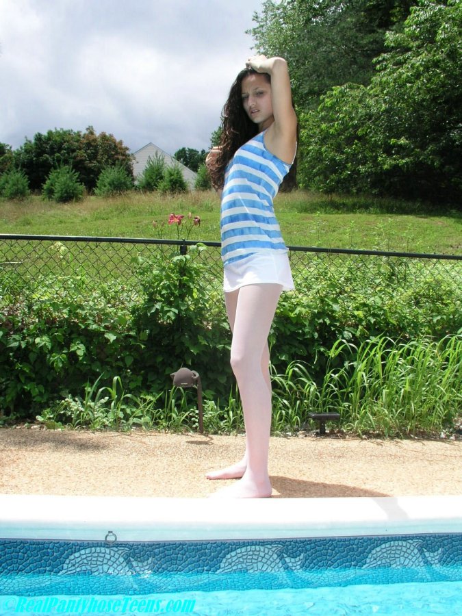 We have several more galleries to share with you folks of the lovely Bea from REAL PANTYHOSE TEENS. We hope you’ve been enjoying what we’ve shared so far as we’ve always been big fans of this adorable leg model. Not sure why it took Bob announcing the closure of the site for us to get more of this cutie out to you folks. In any case enjoy these free sample images from the site in which this petite babe is posing by the pool in her white shorts with matching white pantyhose. Bea hops into the pool so fans of wet pantyhose are particularly going to enjoy this free gallery. Once she’s done with her little swim, Bea strips down to her bra and panties to further tease us in her nylons.