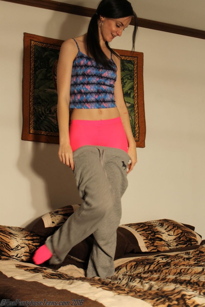 We hope you’ve been enjoying the recent posts that we have been dedicating to REAL PANTYHOSE TEENS, one of our favourite sites. As mentioned previously, Bob has announced the site will be closing shortly so we are trying to get as many people to visit and signup to give him a great sendoff. We have another free gallery featuring petite model Jenna, who is taking off her track pants to show off her amazing ass and legs in pink opaque pantyhose.