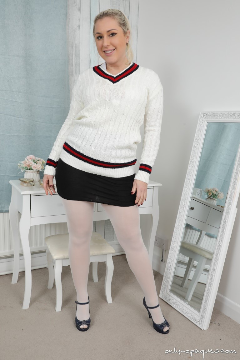 If you like your models a little on the curvy side, you’re going to love this free gallery of Jenny James from ONLY OPAQUES. This sexy blonde is showing off those shapely legs while posing in white sweater, black miniskirt and white opaque pantyhose. Her open toe high heels are pretty sexy as well and you get to see her toes peeking out throughout the shoot as she leaves her shoes on the whole time. Jenny starts her tease poses by showing off that amazing ass. She bends over at the waist and pulls the skirt up, giving us a brilliant view of her booty in tights.