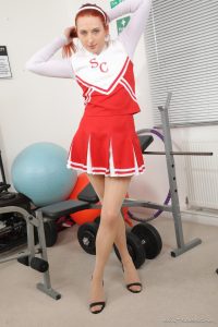 The lovely Minx is posing in a cute cheerleader uniform in this free gallery from ONLY TEASE. Her cheer outfit includes a tight “SC” top and a short pleated miniskirt. The high heels are definitely not part of a regular cheerleader outfit but look sexy nonetheless. Those amazing legs of hers are encased in sheer beige pantyhose and those open toe high heels give us a pretty good look at her sexy feet and toes. This cutie turns her back to the camera and allows the photographer to shoot up her skirt, giving us our first glimpse at that beautiful ass.
