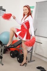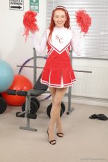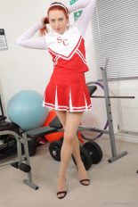 The lovely Minx is posing in a cute cheerleader uniform in this free gallery from ONLY TEASE. Her cheer outfit includes a tight “SC” top and a short pleated miniskirt. The high heels are definitely not part of a regular cheerleader outfit but look sexy nonetheless. Those amazing legs of hers are encased in sheer beige pantyhose and those open toe high heels give us a pretty good look at her sexy feet and toes. This cutie turns her back to the camera and allows the photographer to shoot up her skirt, giving us our first glimpse at that beautiful ass.