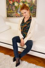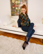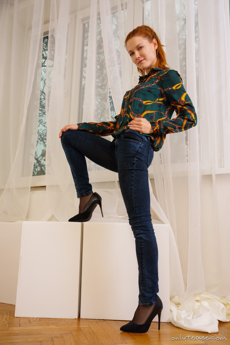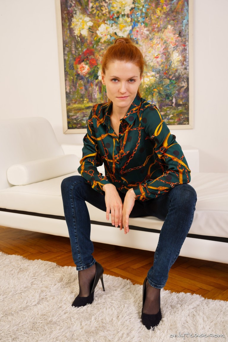 If you’re a fan of leggy babes wearing jeans over pantyhose, you’re going to love this free gallery of Terry Z from ONLY TEASE. She is wearing quite the colourful shirt with a pair of high heels and tight blue jeans over her sheer black nylons. This slim redhead lounges on the couch and allows you to see a bit of her pantyhose around her feet and ankles. She decides to start her striptease by unbuttoning her shirt and revealing the black bra she is wearing underneath. Terry has quite the lovely cleavage, doesn’t she?