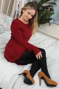 The sensational Suzi from ONLY OPAQUES is featured in this free gallery from the site and looking as sexy as ever. She is posing in the bedroom wearing a sweater dress with high heels and black opaque pantyhose. The dress is nice and short so you get quite the eyeful of her beautiful legs in those black tights. This hot blonde babe lies down on the bed and extends her legs in the air, dramatically improving the view and even giving us a quick look at that lovely ass of hers.