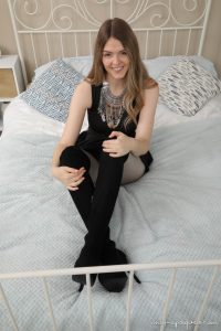 Rosie D sits on the side of the bed and unzips her boots, removing them and exposing her cute nylon-clad feet. Turning her back to the camera, she slowly slides off her minidress and you immediately get to check out those wonderful tits of hers as she isn’t wearing a bra underneath. Those nice, full breasts look incredible, don’t they? Rosie finishes this photoshoot wearing nothing but her panties, pantyhose and that sexy necklace. Enjoy the free gallery and if you’d like to see more hot babes in sexy outfits and opaque pantyhose, click HERE for instant access to OnlyAllSites today!