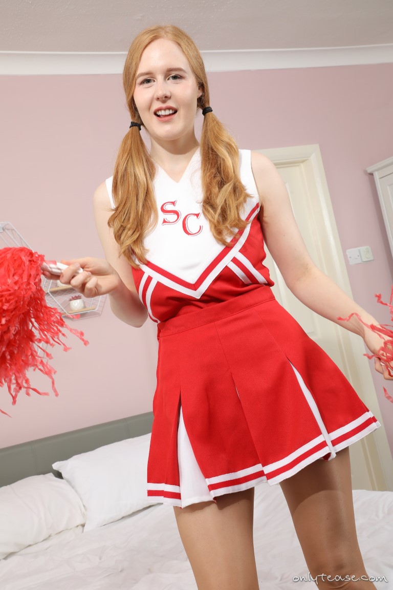 Gorgeous redhead Aurora Phoenix is featured in today’s free gallery from ONLY TEASE in a very cute cheerleader uniform with a pair of strappy high heels and sheer, shiny pantyhose on those lovely legs. Yes, those open toe high heels and probably not realistic for the outfit but I still think they are pretty damn sexy. Aurora kneels on the bed, keeping one foot on the ground and giving us a pretty nice upskirt view in the process. Wouldn’t you just love to help this cute cheerleader out of her uniform? I know I sure would.