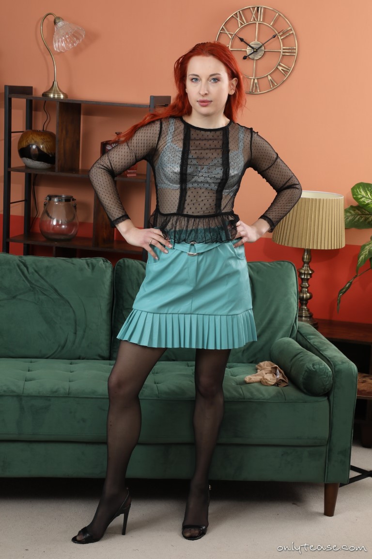 Here’s another gallery from ONLY TEASE of the lovely Minx for you to check out today. When she first appeared at the sites, she had blonde hair but has recently taken on the look of a ravishing redhead. What do you prefer? Regardless of her hair colour, this babe looks very hot as she poses for us in a miniskirt and a sheer black top that allows us to see the bra she is wearing underneath. Black open toe high heels and sheer black pantyhose finishes off this very sexy outfit.