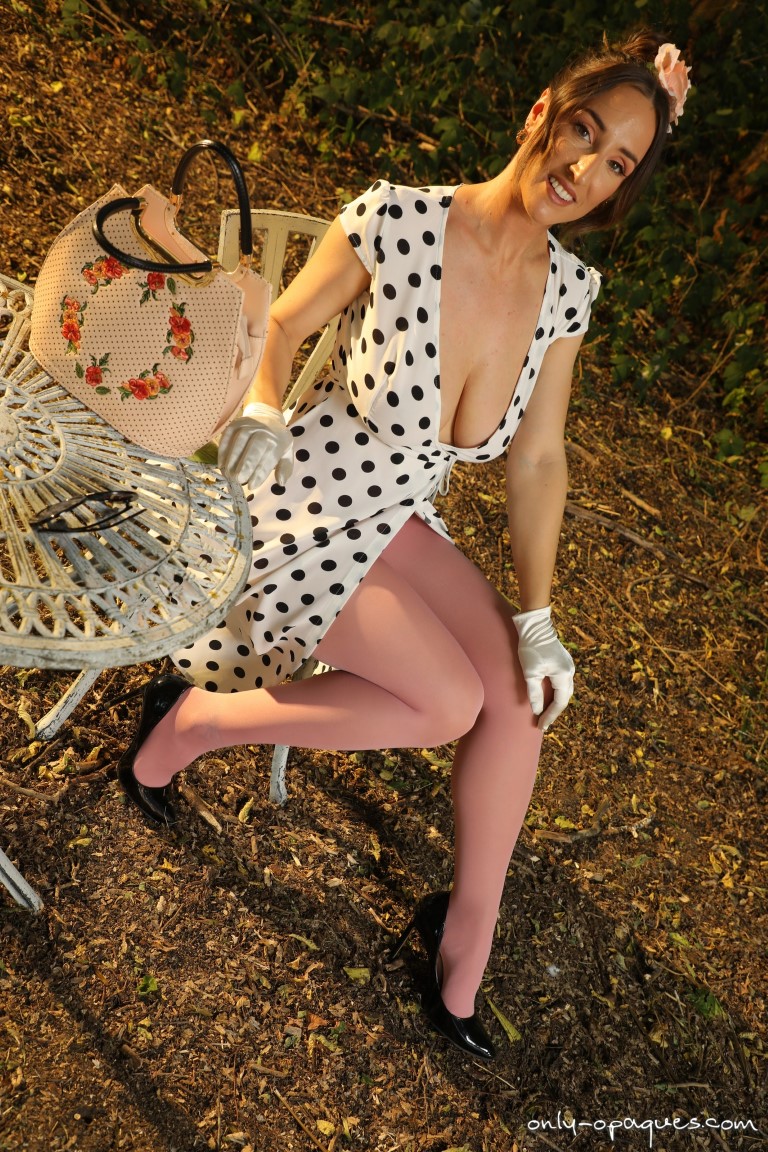 Busty babe Stacey P is back and teasing us in this free gallery from the team over at ONLY OPAQUES. This sexy glamour model is posing outside for us in a cute polka dot sundress that really throws off a retro vibe. It is very low cut so you get to see that amazing cleavage of hers as she enjoys the last little bit of the sun late in the day. Stacey is also wearing a pair of high heels and pink opaque pantyhose on those curvy legs of hers. The dress has a slit up the front so we get quite the view of them.