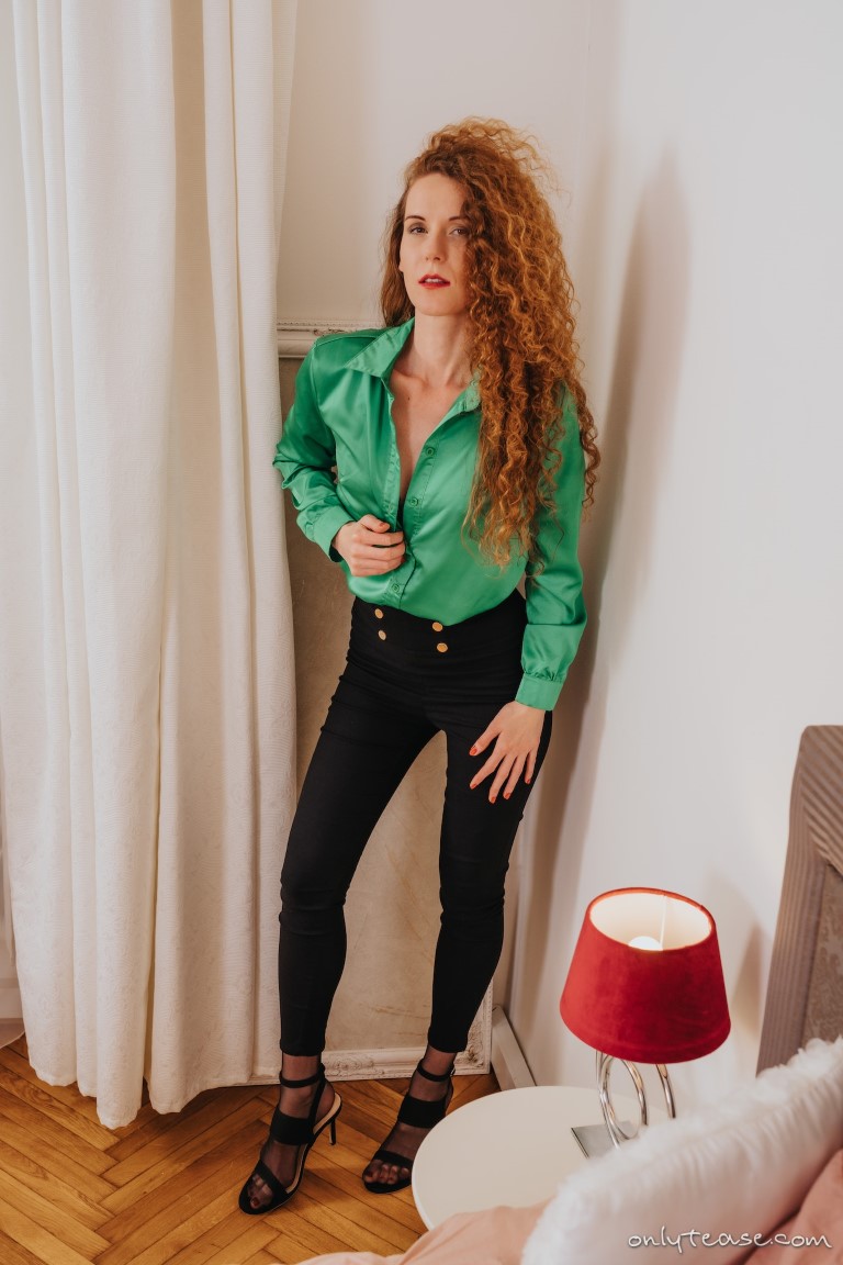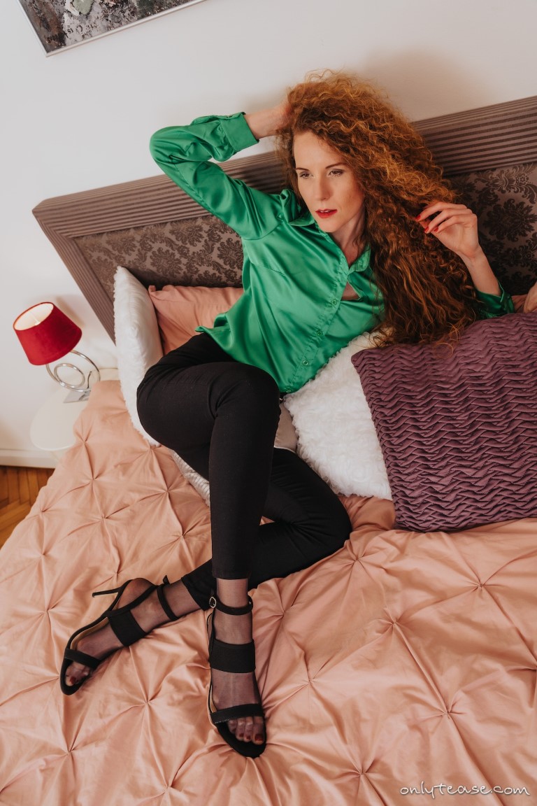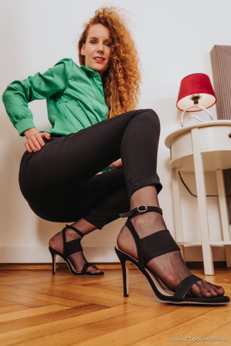 The ravishing Rose M makes her debut here at My Pantyhose Blog in this free gallery from the folks over at ONLY TEASE. This leggy babe is posing for some amazing hose under trousers pictures for us wearing tight black pants and strappy open toe high heels over her sheer black pantyhose. Rose also is wearing a green blouse for us that she has conveniently left unbuttoned a bit more than she should, tempting us with a potential down blouse view of her tits every time she poses a certain way.