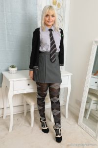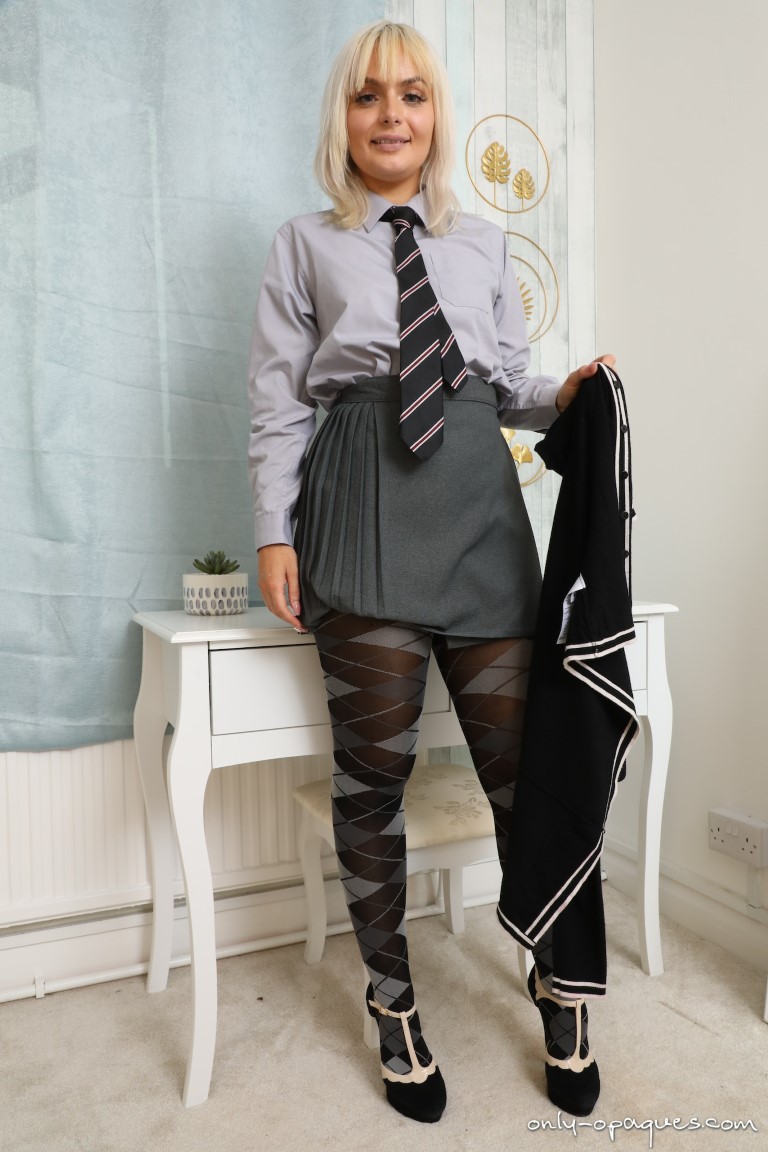 Here’s a free gallery of cute newcomer Lexie Doll from ONLY OPAQUES. This cute blonde is wearing a schoolgirl uniform that includes a pleated miniskirt with killer high heels and plaid patterned pantyhose on those sexy legs. When she crosses her legs at the knee, you pretty much see up her skirt. What a tease! Lexie improves the view by turning her back to the camera and lifts her skirt around her waist, showing off that beautiful ass in those patterned tights. She slides that off altogether and then slowly unbuttons her blouse, exposing those small, adorable tits. Want to see more of this cutie and other hot babes in uniforms and opaque pantyhose? Click HERE for instant access to HERE!
