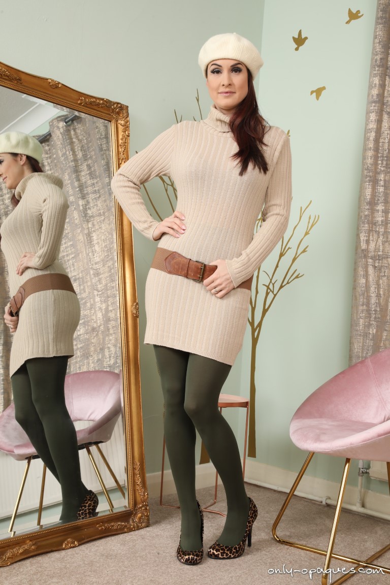 I have another free gallery from ONLY OPAQUES to share with you today, this time featuring Petra V and those killer curves of hers. She is posing for us in a cute sweater dress with a belt around her waist to highlight those lovely hips of hers. Petra is also wearing a pair of high heels and green opaque pantyhose on her long, shapely legs. This sexy glamour model is admiring her own beauty in the mirror while showing off a whole lot of leg. She pulls the dress around her waist to further tempt us with her brilliant ass in tights. Petra pulls the dress up over her head and reveals her ample cleavage in a tight fitting bra before finishing topless, exposing those nice, full tits to the camera. Want to see more of Petra and other hot models in opaque pantyhose and stockings? Click HERE for instant access to Only-Opaques today!