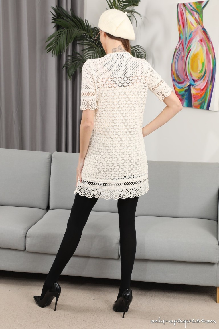 The gorgeous Natalie D is showing off those amazing legs of hers in this free gallery from ONLY OPAQUES. She is posing for us in a white lace minidress and matching beret with black high heels and black opaque pantyhose. Those long, slim legs look incredibly hot in those black tights, don’t they? Natalie relaxes on the couch and spreads her legs for us while flashing that sultry, seductive look at the camera. She tempts us with that amazing ass of hers by pulling the dress around her waist before removing it entirely and posing in her pink bra and matching thong panties. Her small perky tits are soon bared with Natalie removing and tossing her bra aside. Enjoy the free gallery and for more hot babes in sexy outfits and opaque pantyhose click HERE for instant access to Only-Opaques!