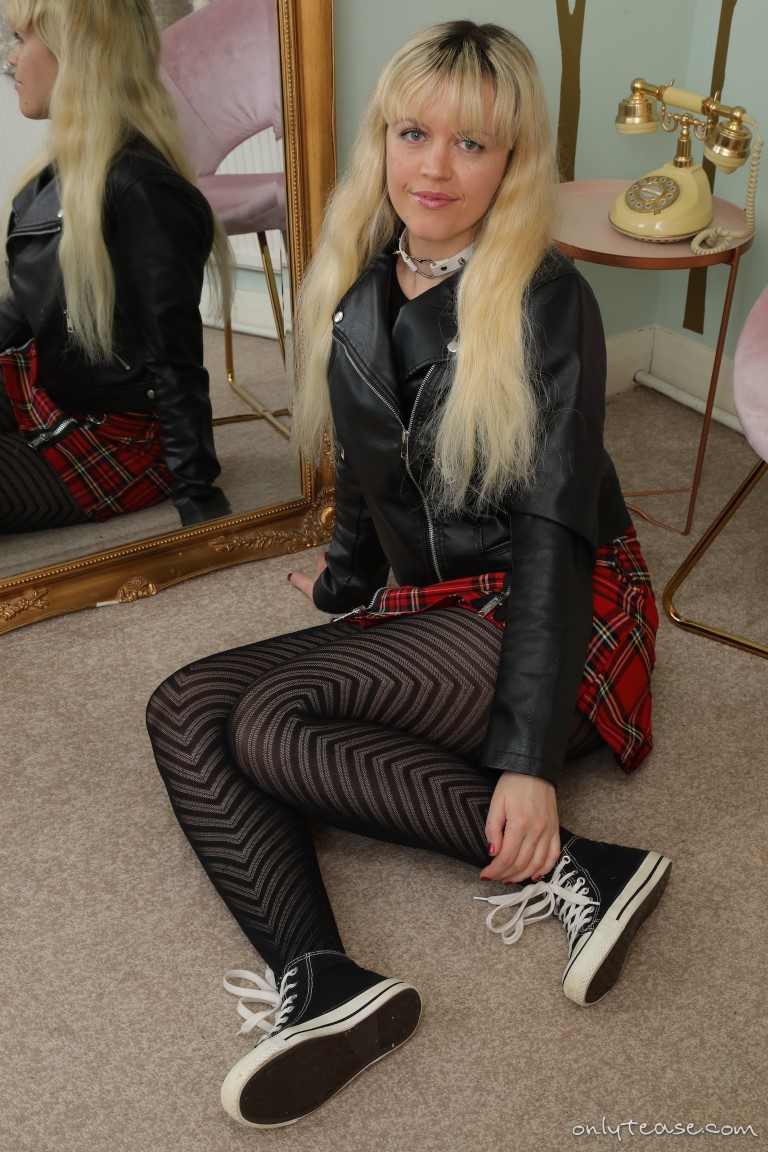 If you’re a fan of blondes or plaid miniskirt, I think you’re going to like this free gallery of Jessy Fiery from ONLY TEASE. She is posing as a cute rocker chick wearing a leather jacket, red plaid miniskirt and a pair of sneakers. Those incredible legs of hers are encased in black patterned pantyhose. Jessy removes her jacket and shows that she is wearing a sheer black crop top underneath. This also allows us to check out the black bra she is wearing underneath. This cutie starts stripping in front of the mirror, putting her clothes on the chair until she is topless in her tights and black lace panties. I absolutely love the view in the final picture in which she tempts us with her killer ass and legs. Want to see more of Jessy and other beautiful babes in pantyhose? Click HERE for instant access to OnlyTease!