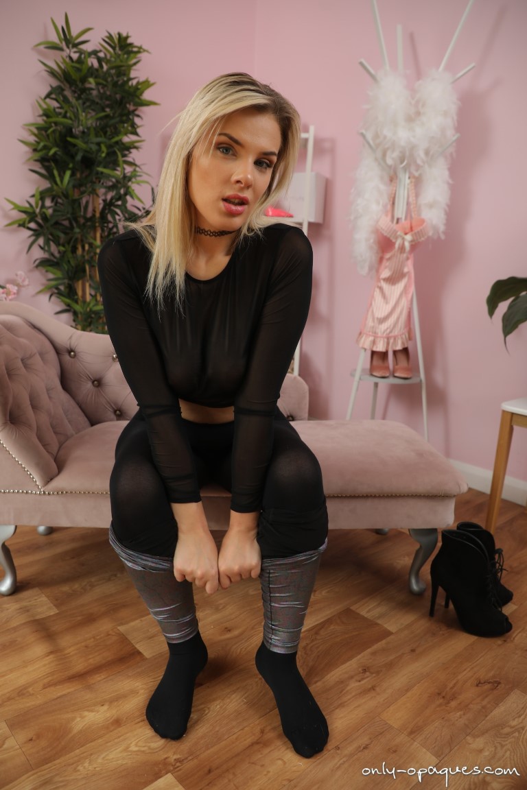 Beautiful blonde babe Asha Evans returns to My Pantyhose Blog today in this free gallery from ONLY OPAQUES. She is posing for some killer hose under trousers pictures while wearing a sexy outfit that includes a sheer black crop top with tight shiny leggings and ankle boots. Asha pulls down the front of her pants and flashes the waist band of her black opaque pantyhose to us. This lovely glamour sits on the couch and removes her boots before peeling off her pants to show off those sexy legs and ass in her black tights. She pulls those off and replaces them with sheer stockings, tempting us with that amazing ass in panties. Asha finally uncovers those beautiful breasts by pulling off her top to finish off her photo shoot. Enjoy the free gallery and for more sexy babes in opaque pantyhose and stockings, click HERE for instant access to Only-Opaques!