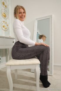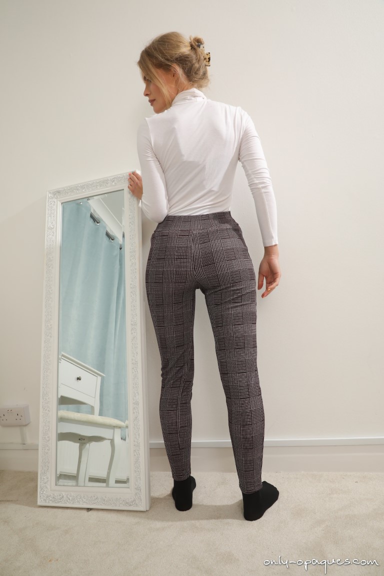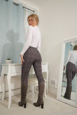 The tantalizing Tayla is posing for some amazing hose under trousers pictures in this free gallery from ONLY OPAQUES. She starts out in a white long sleeve shirt, tight plaid pants and knee high boots. While you don’t get to see her tights right away, you do when Tayla removes her boots and shows off her sexy feet in black opaque pantyhose. This sexy babe then slides off her pants, giving us a really nice view of her incredible ass. The rest of her outfit comes off and she even pulls down her nylons to tease us in her matching red lace bra and panties. I’ve recently become a fan of this sexy babe and that slim, fit body of hers. What do you folks think? Enjoy the free gallery and to see more of Tayla and other beautiful babes in sexy outfits with opaque pantyhose and stockings, click HERE for instant access to Only-Opaques!