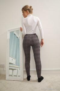 Tayla wearing tight plaid pants and knee boots over black pantyhose