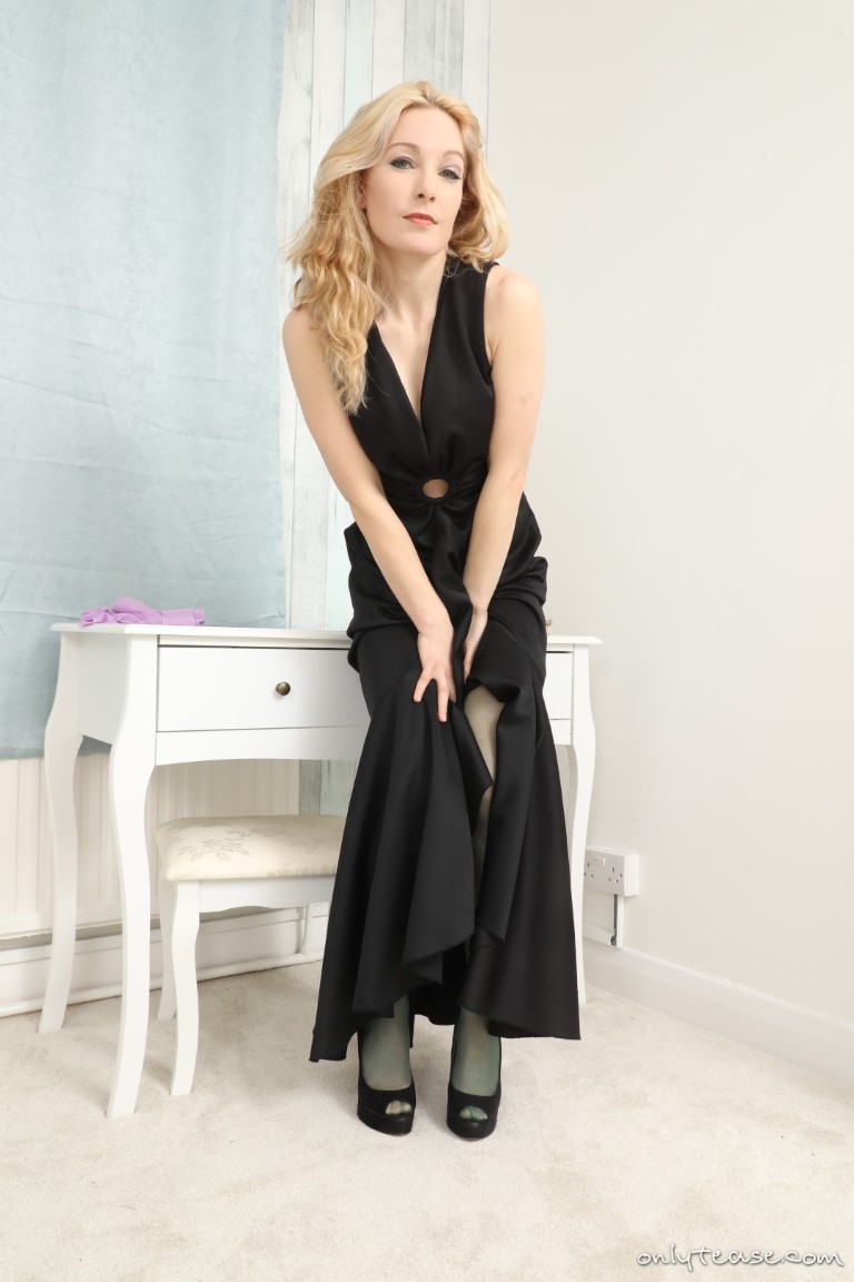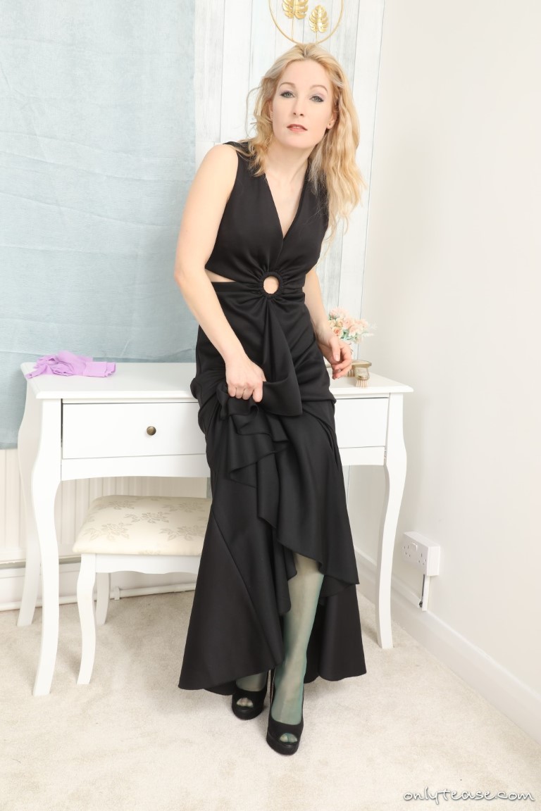 Beautiful blonde glamour model Princess Anna returns to MyPantyhoseBlog in this free gallery from OnlyTease. She starts things out in a long black evening dress with a pair of matching black high heels. Anna slides the dress to the side a bit to expose her lovely legs in sheer green pantyhose. Not happy with the colour and how it matches her outfit, this leggy babe decides to change her nylons. But first she must remove her dress to tease us in her matching green bra and panties. The green pantyhose comes off and Anna instead puts on light purple sheer nylons instead. Instead of putting the dress back on this hot glamour model instead removes her bra and goes topless. For more sexy babes in lingerie and pantyhose, click HERE for instant access to OnlyAllSites!