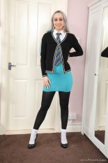 The lovely Tania Aresti is posing in a cute college uniform in this free gallery from OnlyTease. She is posing for us in the bedroom in a schoolgirl outfit that includes a sweater over her necktie and white blouse with a tight light blue miniskirt. Tania is also wearing high heels and white ankle socks with black opaque pantyhose on those slim, sexy legs of hers. This cutie tosses aside her sweater before presenting her ass in tights and white panties by pulling her skirt around her waist. Her legs look incredible in that shot, don’t you think? Watch as she sheds the rest of her uniform to tempt us with those adorable tits while posing topless in her nylons, panties and high heels. Want to see more cute babes posing in schoolgirl uniforms and pantyhose? Click HERE for instant access to OnlyAllSites today!