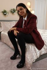 Cute and petite babe Emmeline is posing for us in a sexy schoolgirl outfit in this free gallery from Only-Opaques. She is posing for us in a short plaid pleated miniskirt with shiny black high heels and black opaque pantyhose. This cutie removes her jacket and necktie before unfastening and tossing aside that short skirt. This high heels come off next so you can check out her feet in tights. Emmeline removes her blouse and exposes those small adorable tits to the camera. Want to see more of this hot babe and other sexy glamour models in uniforms and pantyhose? Click HERE for instant access to OnlyAllSites today!