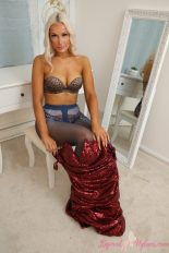 Beautiful blonde Paige F in looking elegant and sexy in this free gallery from Layered Nylons. She is wearing a sexy red evening dress that blocks the view of her legs to start. This hot model doesn’t make us wait long to see them though as she takes a seat and pulls it up around her waist giving us a nice look at her high heels, panties and suspenders with sheer black pantyhose over her sheer stockings. Paige slides the dress straps off her shoulders and pushes it down her body, revealing her amazing cleavage in a strapless bra. That comes off but those cute tits of hers are hidden behind a hand bra pose. Want to see more of Paige F and other sexy models wearing both pantyhose and stockings? Click HERE for instant access to Layered-Nylons today!