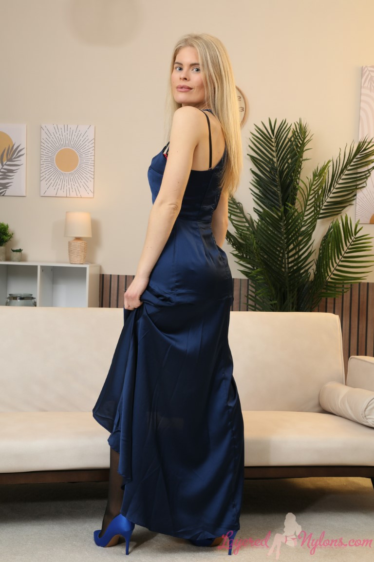 Beautiful blonde Tayla is looking quite elegant and sexy in this free gallery from Layered Nylons. She is posing in a long blue evening gown with a pair of light blue high heels. Those lovely legs of hers are encased in sheer black pantyhose, which she has pulled up over her garter and sheer beige stockings. Tayla does some leg tease poses for us but things heat up when she slips out of her dress and poses in her bra and panties. You get a really look at that killer ass of hers when she turns her back to the camera and shows if off in nylons and thong panties. Want to see more beautiful babes posing in pantyhose and stockings? Click HERE for instant access to Layered-Nylons!