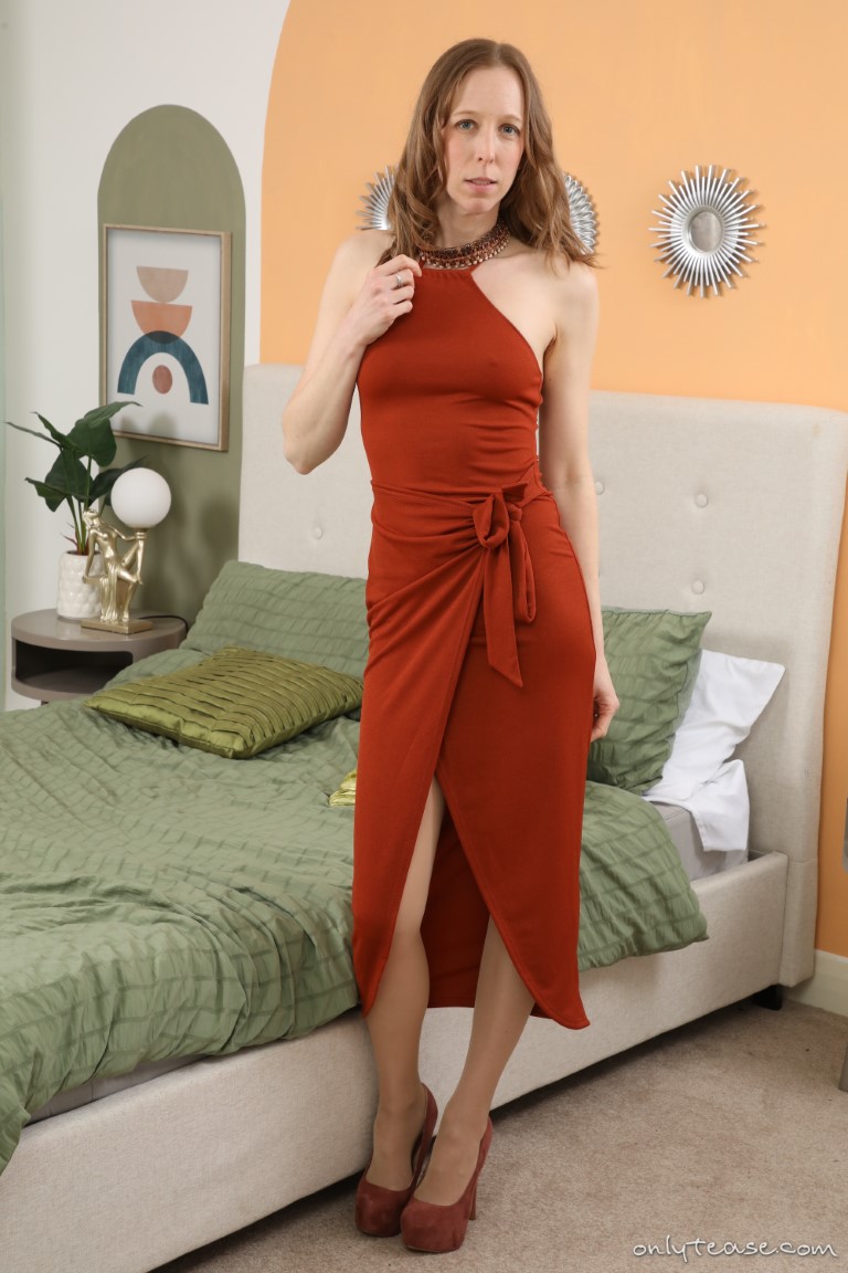 Leggy babe Charlotte V is teasing in the bedroom in quite the sexy dress in this free gallery from OnlyTease. It looks like she is ready to go to a formal event of gala in her long elegant dress and a pair of high heels. When she sits on the side of the bed and crosses her legs, the slit up the side of her dress gives us quite the view of her amazing legs in sheer beige pantyhose. Charlotte pulls up the dress to show off her black panties before removing her high heels and slipping out of the dress. This exposes her small perky tits as she teases in her panties and nylons. Want to see more of Charlotte and other beautiful babes teasing in pantyhose? Click HERE to visit OnlyAllSites today!