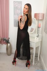 Sexy glamour model Hattie Grace isn’t leaving much to the imagination in this free gallery from GlossTightsGlamour. She is wearing a long sheer black dress and since she isn’t wearing a bra she can’t hide those cute tits of hers. When she turns around you may notice she also decided not to wear panties so you get a good look at the beautiful ass of hers. Hattie finishes off this hot and sexy outfit with black and red high heels and shiny black pantyhose. Kneeling on the bed she pulls off her dress and continues with some amazing leg tease poses. If you’re a fan of hot babes in shiny pantyhose, I highly recommend you visit GlossTightsGlamour. Click HERE to check it out!
