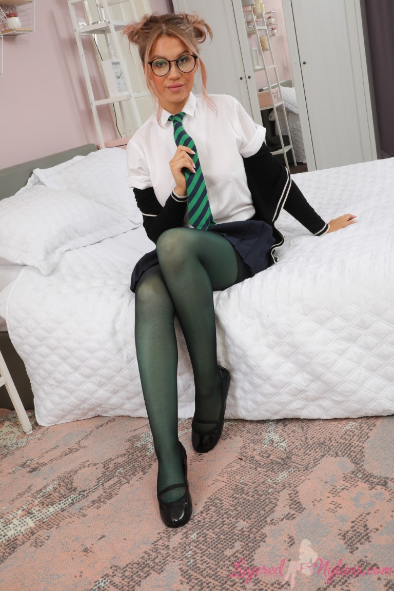 I have a free gallery of cute babe Zoey King to share with you, this time from the archives of Layered Nylons. This sexy babe is posing in a cute schoolgirl uniform that includes a black pleated miniskirt with a black sweater over her white blouse. She finishes off her college girl outfit wearing suspenders and black stockings over sheer green pantyhose. Zoey removes her sweater, skirt and blouse to expose those amazing breasts to the camera. Wouldn’t you just love to be the lucky guy to gets to join her on the bed? You can see more of Zoey and other beautiful babes teasing in pantyhose and stockings over at Layered-Nylons by clicking HERE!