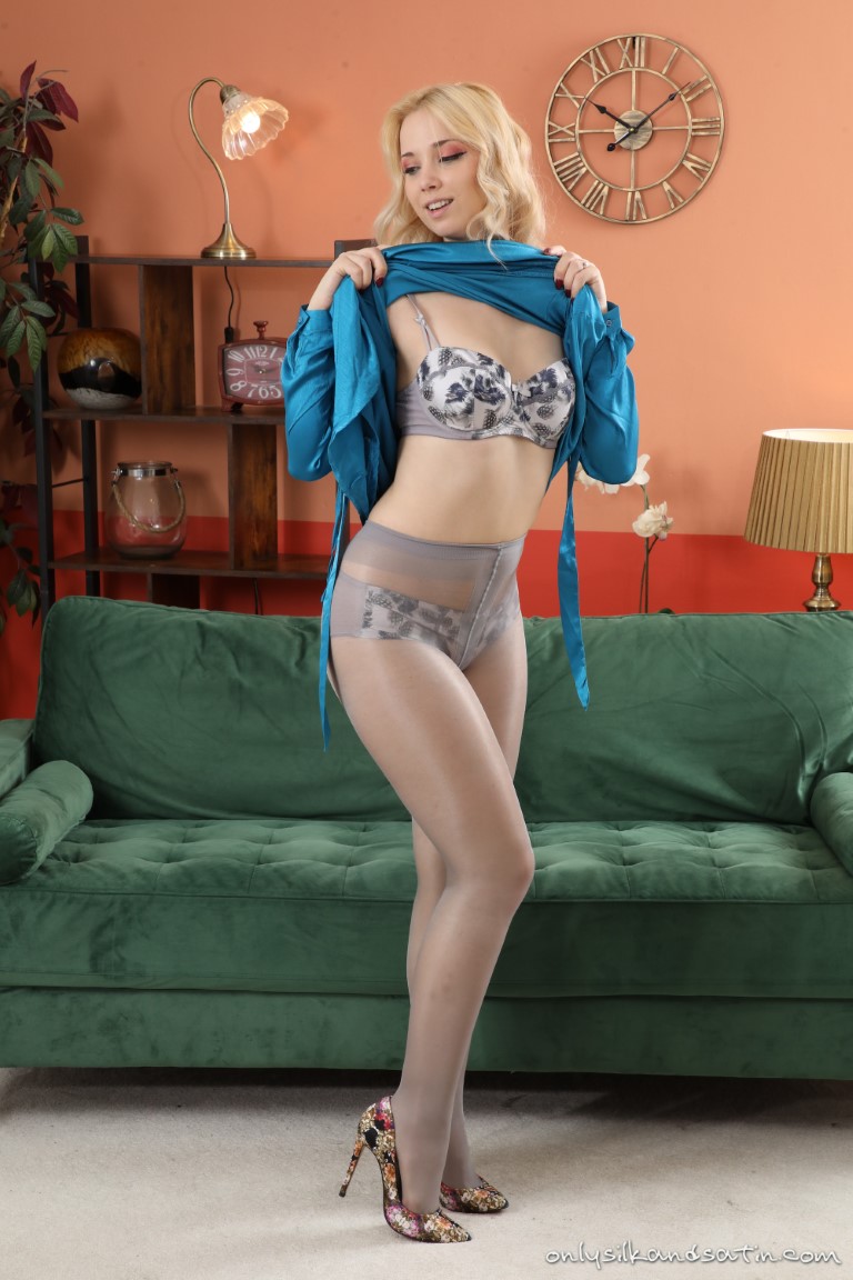 If you are a fan of Lil Missy UK, check out this free gallery from one of her recent updates over at OnlySilkAndSatin. This hot babe is wearing a long blue dress with a pair of high heels and shiny grey pantyhose. Missy wants us to get a better look at her legs so she pulls the dress up, flashing her panties at us in the process. This sexy glamour model removes the dress to reveal the matching bra. That comes off as well leaving her topless in her panties and nylons. She has recently finished another shoot with OnlyAllSites where she is now going fully nude. I highly recommend you check out all her updates by clicking HERE!