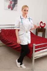 Curvy glamour model Emma Rachael is posing as a sexy nurse in this free gallery from the archives of OnlyTease. She is wearing a white medical coat with white sneakers and black opaque pantyhose. Emma lies down on the bed and rolls on her side, allowing us to check out her curvy ass in panties and tights. Her shoes come off before this sexy babe unbuttons her uniform and shows off her amazing cleavage in a tight fitting bra. With the coat removed she unclasps her bra and removes it, exposing her big beautiful breasts to the camera. Want to see more sexy babes in uniforms and pantyhose? Click HERE for instant access to OnlyTease!