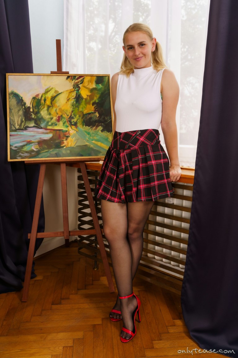 Here is another gallery featuring one of my favourite blonde girls – the cute and sexy Kristy from OnlyTease. She is tempting us with those lovely legs of hers in sheer black pantyhose while wearing a bodysuit, red open toe high heels and a plaid pleated miniskirt. She has her hair up in pigtails, which I think is a really cute look. Kristy slides off her skirt to show off her cute bum in that tight top before removing that as well. This cutie teases in her green lace bra and panties before going topless and presenting those lovely tits to the camera. Are you a fan of Kristy or other sexy models in miniskirts and pantyhose? Check out all the amazing updates over at OnlyTease by clicking HERE!