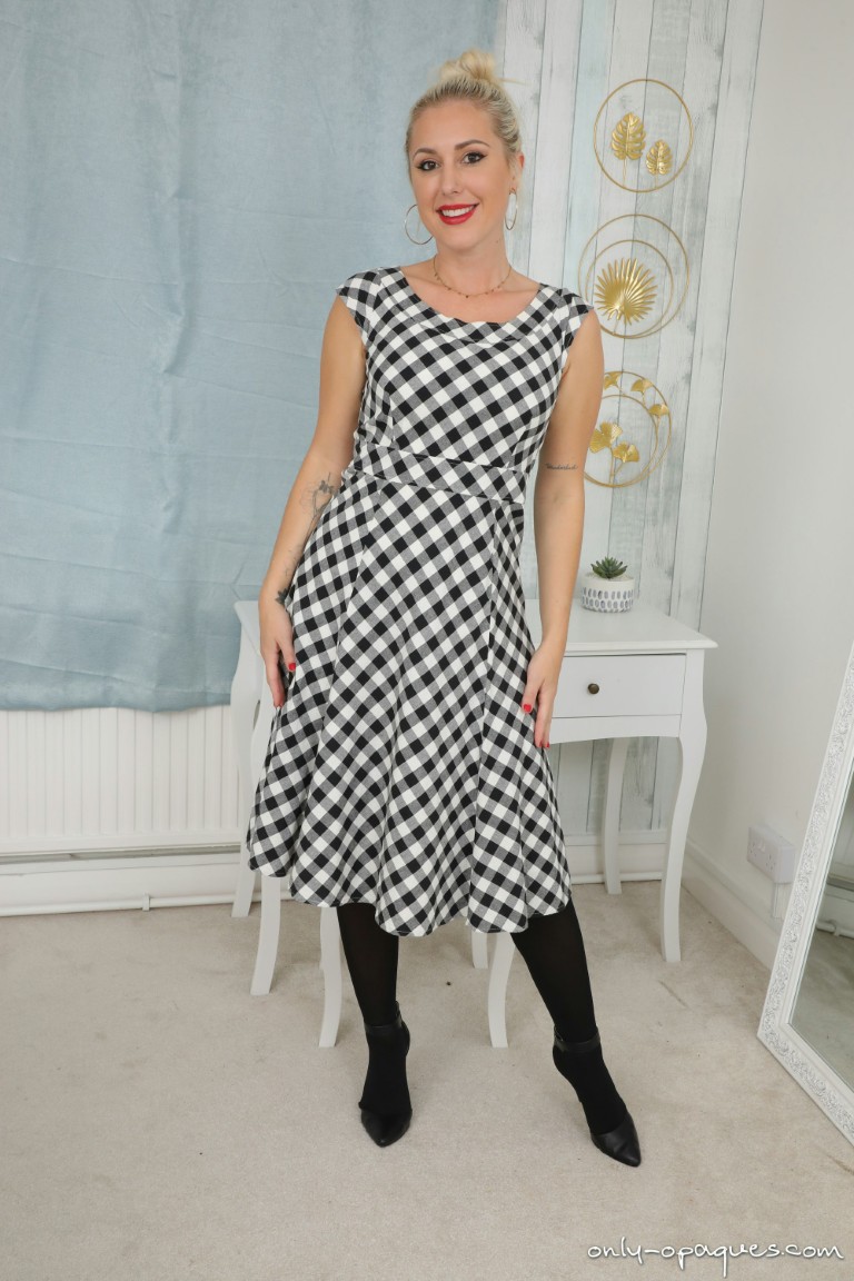 Curvy blonde babe Jenny James is looking very sexy in this free gallery from her recent appearance at Only-Opaques. She is teasing us in a cute checkered minidress with black high heels and black opaque pantyhose. Jenny sits on the stool and spreads her legs, teasing us with an upskirt view. We get to see that amazing bum in tights before she pulls off her dress entirely, revealing her cleavage in a tight fitting bra. We get to check out her breasts (and those cute tanlines!) when she removes her bra and poses topless. Want to see more of Jenny and other beautiful babes teasing in pantyhose? Click HERE for instant access to OnlyAllSites!