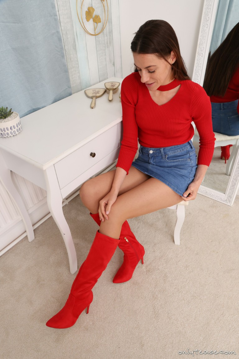 The beautiful Becky X is looking rather sexy as she shows off her long legs in this free gallery from OnlyTease. She is wearing a short jean skirt with a red top and matching red knee high boots. Her choice of nylons are sheer beige pantyhose. Becky pulls up on the bottom of her skirt to flash her panties before turning her back to us and slowly sliding it down. We then get to see her incredible ass in g-string panties. Once her shirt is removed, this beautiful babe teases us in her bra and panties. Enjoy the free gallery and for more hot glamour models in sexy outfits and pantyhose, click HERE for instant access to OnlyAllSites!