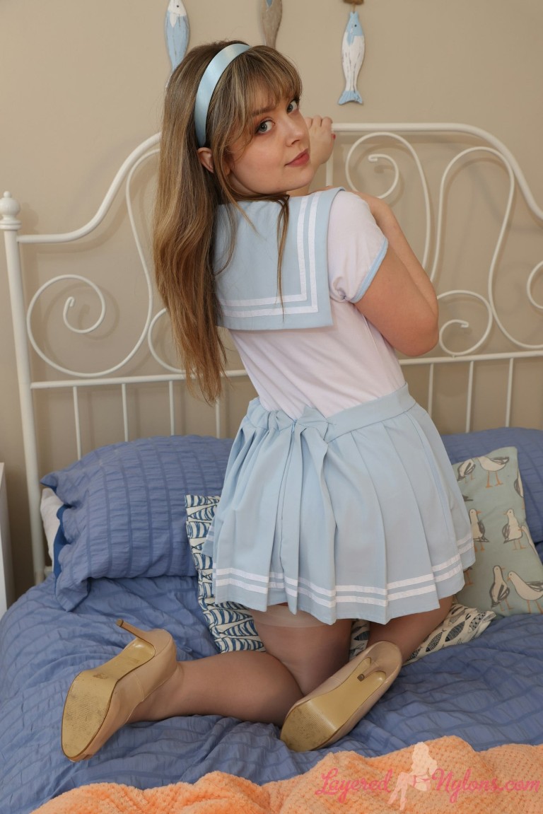 Cute and curvy glamour model Kitty Cashew has certainly made an impression on regular visitors of My Pantyhose Blog and she is quickly becoming one of the most visited models here at the site. She has an amazing smile and sensational curves so it’s not hard to see why really. I always love seeing her in new updates at Layered Nylons and their sister sites. Check out this free gallery of this sexy babe teasing in a sailor girl outfit with high heels and sheer pantyhose over her suspenders and stockings. The outfit comes off, including her pleated skirt and bodysuit to reveal the bra and panties she is wearing underneath. Kitty finishes topless, tempting us with her wonderful tits. Would you like to see more of Kitty Cashew and other hot and sexy models teasing in pantyhose and stockings? Click HERE for instant access to Layered-Nylons today!