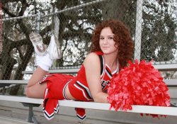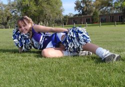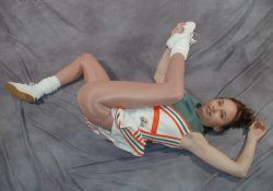 Jessica Louise in a cheerleader uniform with sneakers and beige pantyhose